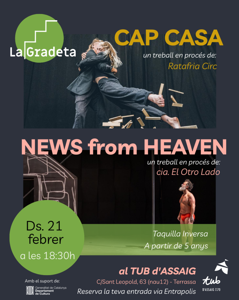 DOBLE GRADETA! CAP CASA (de Ratafria Circ) És curiós: ens diuen que hem de fer vida, però no ens deixen un lloc per viure-la. I mentre construïm, seguim, perquè ens han dit que és el que toca. Dues persones amb uns “trajes” desencaixats. Rodejades d’unes fràgils torres fetes amb trossets de fusta. Una perxa xinesa […]