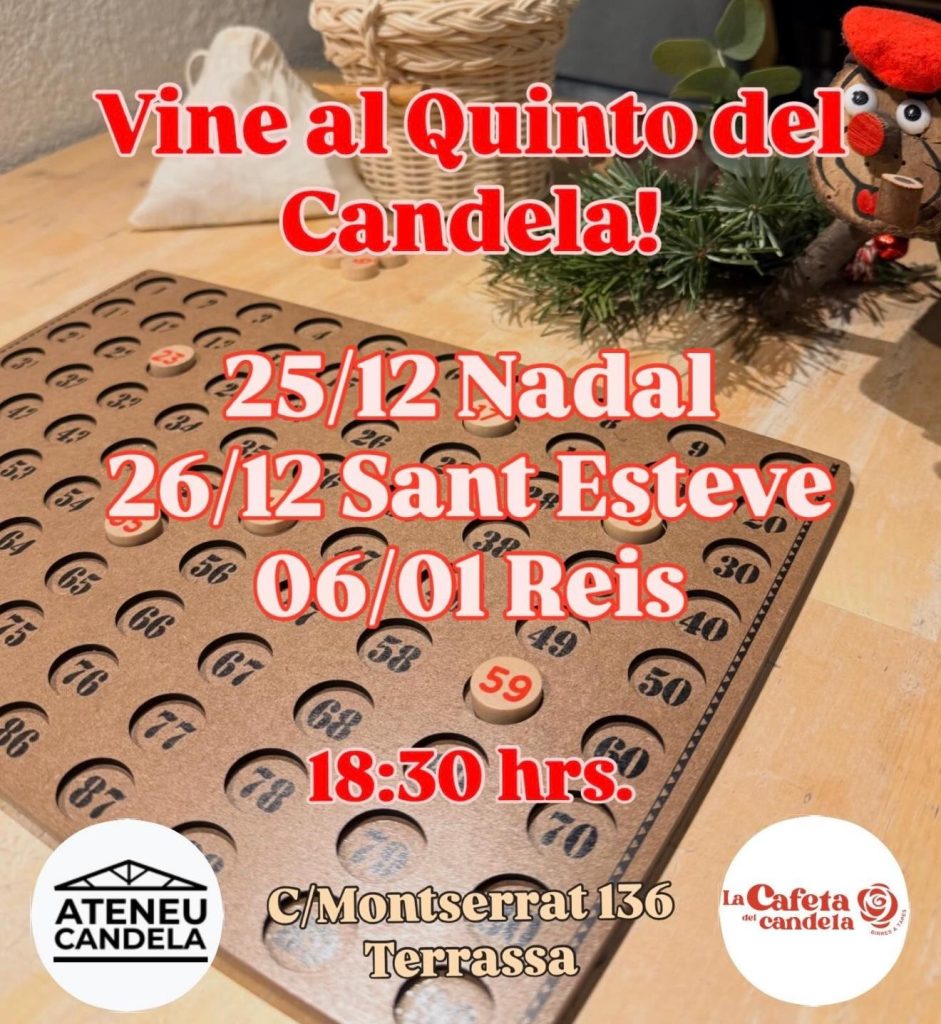 Aquests dies el soroll no serà de copes… 👉 serà de QUINTOOO! Arriben els Quintos de Nadal a l’Ateneu Candela amb @lacafetadelcandela Bon beure, millor companyia i premis que fan il·lusió. Apunta’t les dates!!!