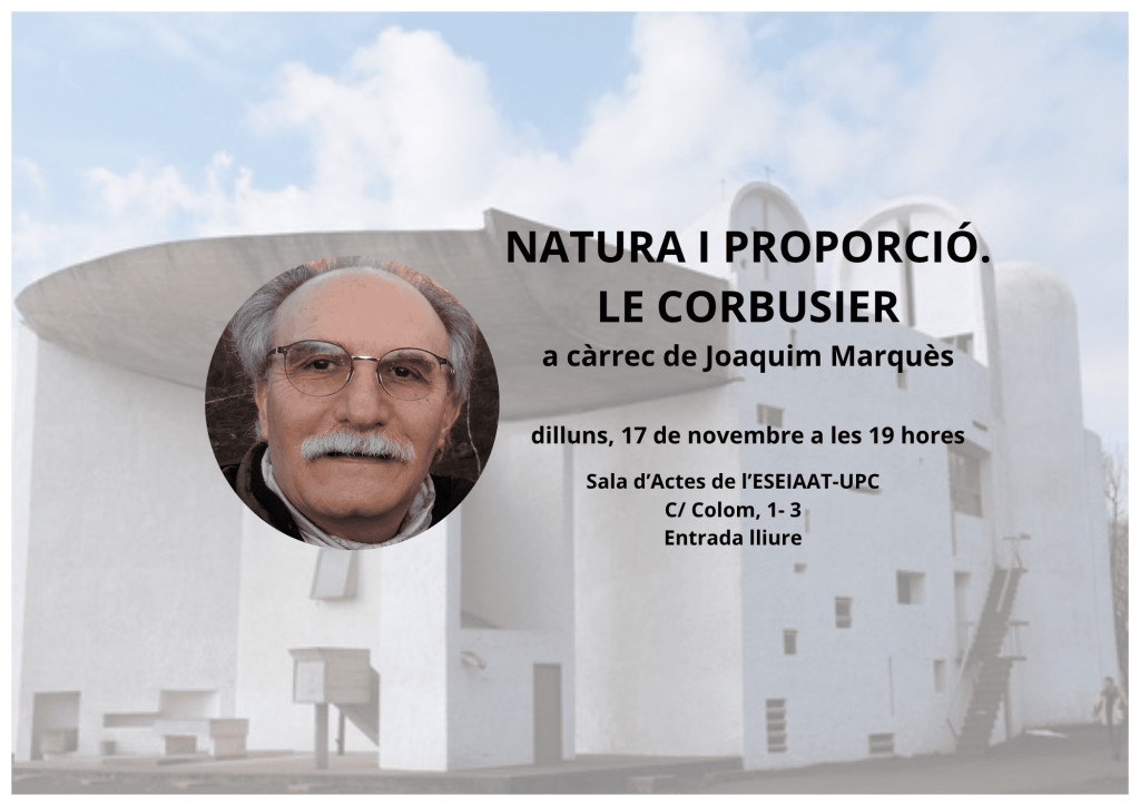 NATURA I PROPORCIÓ. LE CORBUSIER a càrrec de Joaquim Marquès, doctor en Arquitectura per la UPC Natura i proporcions, semblen l’antítesi de l’arquitectura de Le Corbusier i, en general, de tota l’arquitectura racionalista. En aquesta xerrada veurem els punts de connexió i com es produeixen d’una manera no mimètica, sinó cerebralment molt més elaborada.