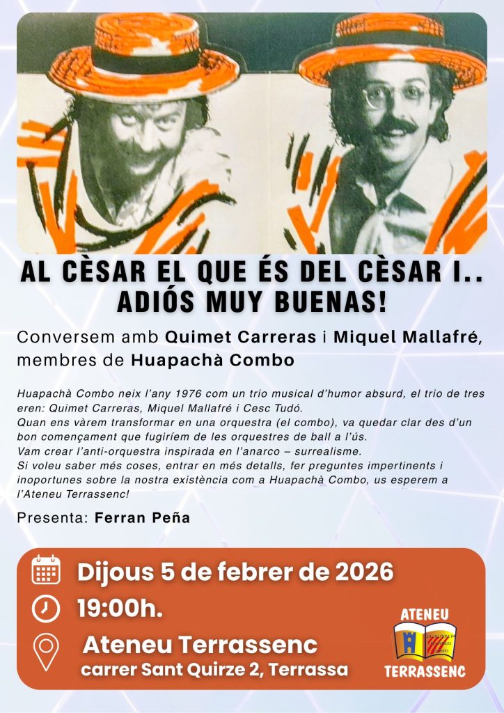 Conversem amb Quimet Carreras i Miquel Mallafré, membres de Huapachà Combo AL CÈSAR EL QUE ÉS DEL CÈSAR I… ADIÓS MUY BUENAS! Huapachà Combo neix l’any 1976 com un trio musical d’humor absurd, el trio de tres eren: Quimet Carreras, Miquel Mallafré i Cesc Tudó. Quan ens vàrem transformar en una orquestra (el combo), va quedar clar des d’un bon […]
