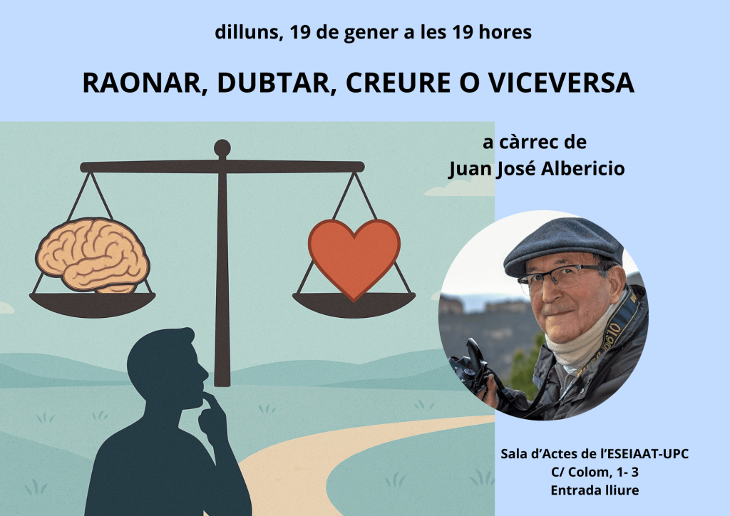 Amb el títol RAONAR, DUBTAR, CREURE O VICEVERSA, a càrrec de Juan José Albericio, Doctor en Ciències de l’Educació per la UAB, llicenciat en Filosofia i Lletres (Pedagogia) per la UB. Autor de la trilogia “Razonas, dudas, crees?”, ens exposarà les causes i conseqüències, el per què i el per a què d’alguns fets i […]
