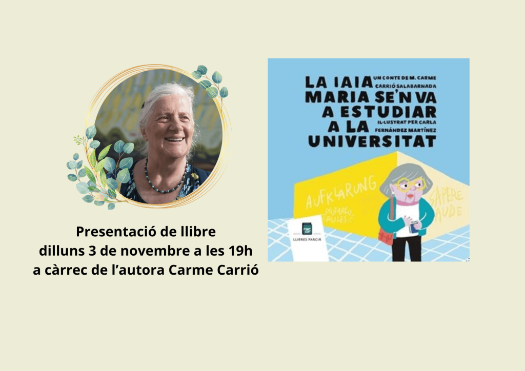 Presentació del llibre LA IAIA MARIA SE’N VA A ESTUDIAR A LA UNIVERSITAT, a càrrec de la seva autora Carme Carrió. Un nou conte per a nois i noies de la iaia Maria. En aquesta ocasió vol aprofitar el temps lliure de què disposa per formar-se, perquè fer-ho no és pas una qüestió d’edat, sinó de voluntat. […]