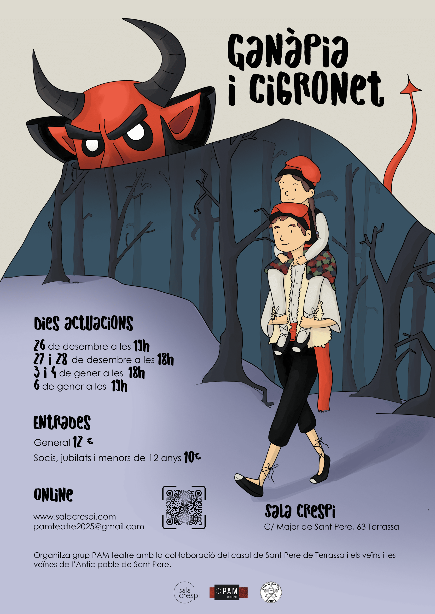 Aquest any tornem amb “Ganàpia i Cigronet” de Francesc A. Izquierda, els mítics pastorets de casa nostra, del Casal de Sant Pere. Des de PAM Teatre tenim un vincle estret amb l’obra, i la tradició de seguir-la representant any rere any. L’any passat, es va presentar lleugerament modernitzada i hi va haver molt bona rebuda; es per això que aquest any hem seguit per el mateix camí, amb l’ambició de fer-vos gaudir encara més. No sabem si ho aconseguirem, però de moment, ja ha valgut la pena; gràcies a les persones que ens han acompanyat en aquest procés curt, però intens; merci per fer que aquesta bonica tradició continuiï restant igual de viva.