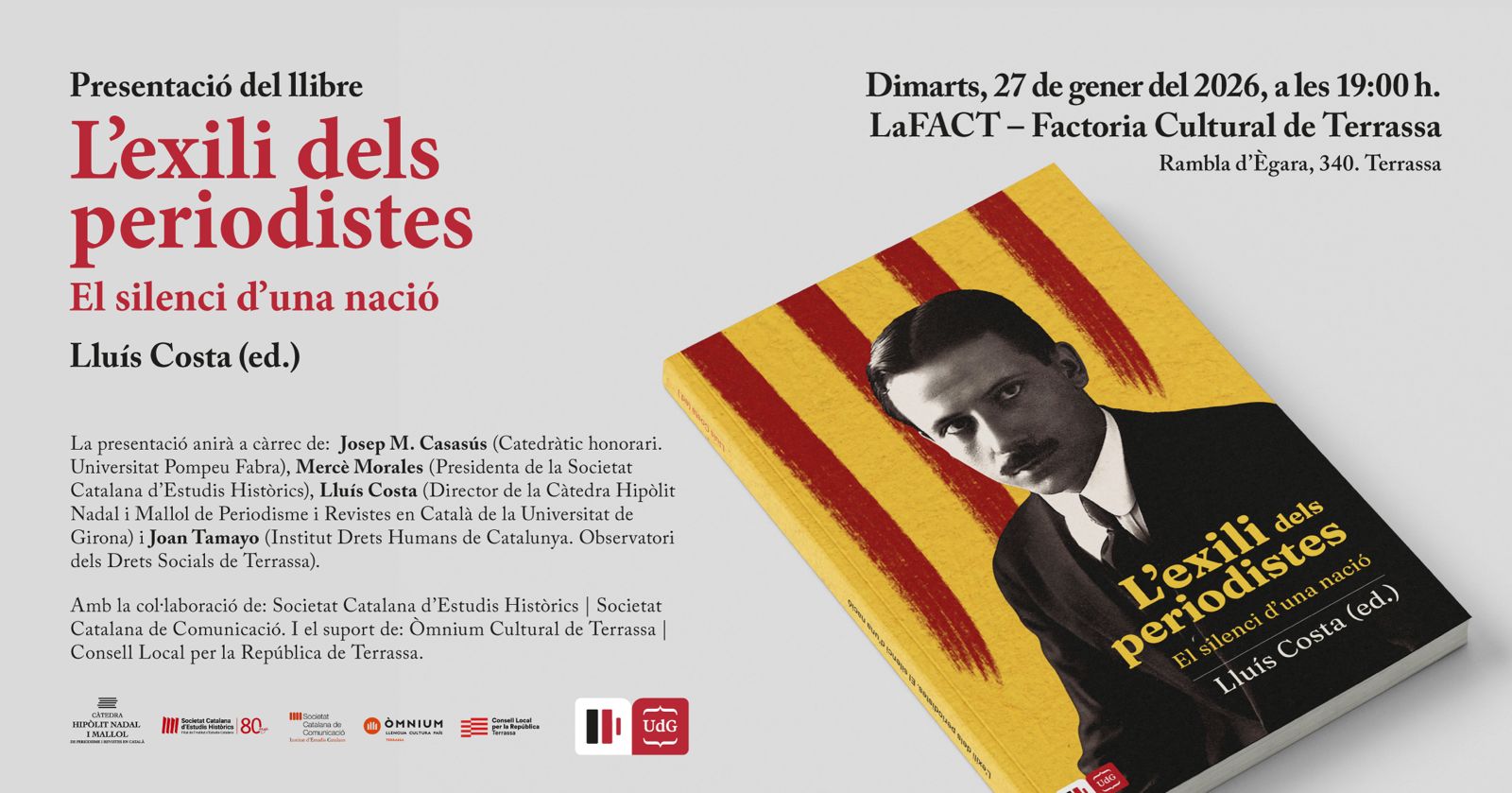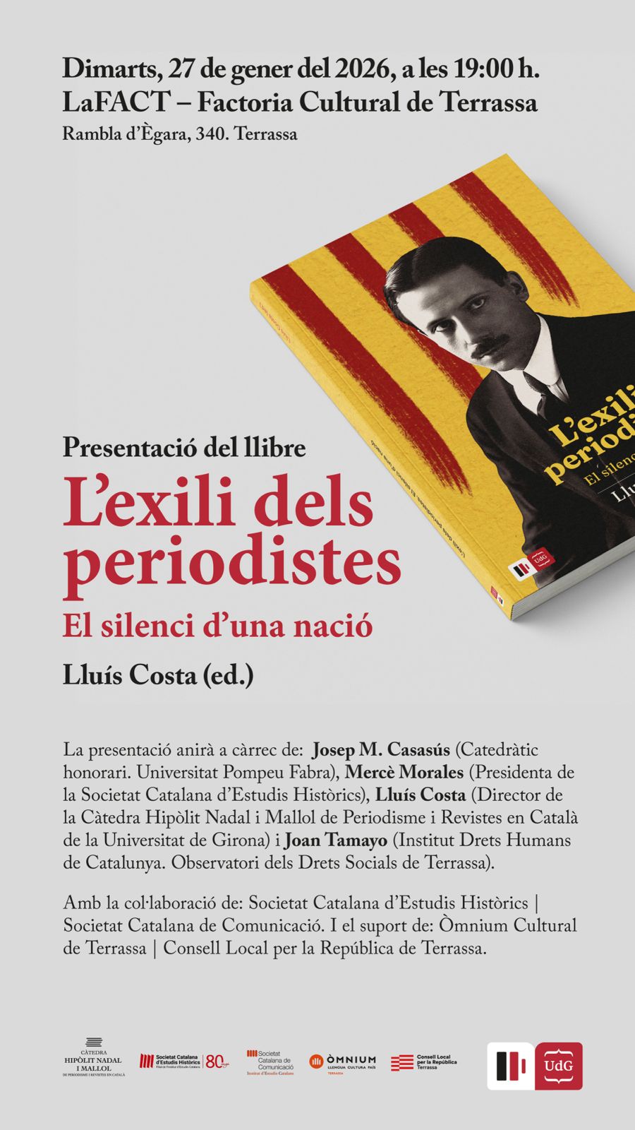 MLa Càtedra Hipòlit Nadal i Mallol de Periodisme i Revistes en Català organitza la presentació del llibre L’exili dels periodistes. El silenci d’una nació, editat per Lluís Costa. L’obra recupera la memòria dels periodistes catalans que es van veure obligats a l’exili després de la Guerra Civil i analitza les conseqüències d’aquest silenci imposat en el sistema informatiu i cultural del país.