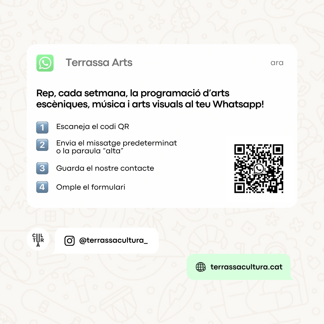 L’Ajuntament de Terrassa, a través del Servei de Promoció i Difusió Cultural, posa en marxa un nou canal d’informació per donar a conèixer, apropar i informar a la ciutadania sobre l’oferta i les activitats artístiques municipals. A través d’aquest nou canal s’informarà a totes aquelles persones interessades, a través de l’aplicació de missatgeria WhatsApp, de la programació, activitats, descomptes, promocions i venda d’entrades dels espectacles que formen part de les diferents temporades artístiques municipals.